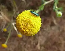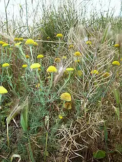 Es una planta anual de aspecto tomentoso, algo rastrera con tallos erguidos, con las hojas profundamente divididas en segmentos lineares. Las flores del disco son de color amarillo, agrupadas en capítulos solitarios de 2-2,5 cm de diámetro, y no tienen lígulas aparentes, pues estas no son generalmente más largas que el involucro, aunque ocasionalmente puede sobrepasar algo este último. En este caso, son en general escasas (6-12) y cortísimas, pero en algunos individuos llegan a tener un tamaño igual a diámetro del disco de flósculos; son de un amarillo más pálido que estos y el envés aún más claro, o bien bicolor con el tubo y la base del limbo amarillo dorado y el resto prácticamente blanco. El receptáculo esta densamente cubierto de escamas obovadas/lanceoladas puntiagudas traslúcidas. Los frutos periféricos son aquenios anchamente alados y el tamaño de estas alas laterales va disminuyendo progresivamente de manera centrípeta hasta desaparecer en los frutos más internos del capítulo.