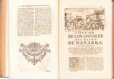 ![]() Frontispicio calcográfico firmado por Gregorio Fosman y Medina para la primera edición de los Anales del Reino de Navarra (1684-1715) | ||