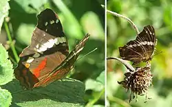 Antenas de color negro, cabeza, tórax y abdomen en su vista ventral son de color café con pelos de color verde pasto. El margen costal de las alas anteriores es ligeramente convexo, el ápice es picudo, el margen externo es curvo y más pronunciado cerca del ápice. El margen interno o anal casi recto. En la célula discal presenta dos pares de líneas delgadas de color negro. Y una banda posdiscal curva de color blanco con amarillo claro que parte del margen costal y llega hasta el margen anal. Presenta tres manchas blancas subapicales y cuatro submarginales. El borde del ala es blanco con gris, con los colores alternados. En las alas posteriores presenta margen costal ligeramente convexo, ápice muy redondo, y el margen externo es curvo. En el margen presenta pelos cortos de color blanco y gris alternadamente. En la región submarginal presenta tres machas blancas y cuatro anaranjadas (carácter distintivo con la especie nominal, ya que en esta banda las siete machas son blancas en la subespecie nominal). En el área discal o mediana presenta una banda roja, el cual se hace más delgada, hacia el margen anal y cambia a color anaranjado. La célula anal es ligeramente más clara, con tono beige. Ventralmente con el mismo patrón de manchas, sin embargo el color café de fondo de las alas es más claro que en la vista dorsal, y moteado a café a partir del área basal en ambas alas. En la celda costal del ala anterior, cerca del área basal presenta escamas rojo-anaranjadas. En el alas posterior submarginal, presenta tres manchas grandes blanco con escasas escamas blancas, y a las otras cuatro manchas, son delgadas de color rojo. La banda media o discal eta compuesta de pocas escamas rojas en su parte más externa y mayormente escamas anaranjadas. Tanto palmos, como tórax y abdomen el color es beige. En el área posbasal presenta una línea café que cruza por la celda Sc+R1-Rs, y celda discal. En la celda Sc+R1-Rs cerca de la vena Rc-R1 presenta un punto blanco. Ambos sexos son casi similares, sin embargo presenta bandas más anchas.[1][2]