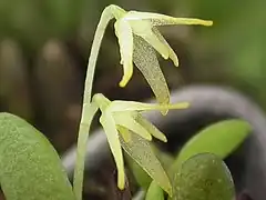 Es una orquídea de tamaño pequeño,que prefiere el clima fresco, con hábitos de epífita. Tiene un ramicale cilíndrico de un color verde claro, envuelto basalmente por una vaina tubular que transporta una sola hoja, apical, erecta, densamente carnosa, de color verde claro a amarillo, lanceolada a oblanceolada, conduplicada con un ápice agudo. Florece en la primavera con una inflorescencia de 2-21,5 cm de largo, con 2 flores.[2]