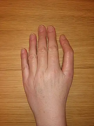 - Triple articulación del pulgar, pequeños o ausentes nudillos, disminución de pliegues cutáneos en articulaciones de los dedos