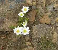 Es una planta herbácea perennifolia, rastrera con tallos erectos cortos y pequeños, las hojas suaves y arrugadas. Cada planta produce flores vistosas, cada una con cinco a ocho sépalos como pétalos. Los sépalos son generalmente de color blanco, a menudo con un tinte azul claro. El centro de la flor está llena de muchos estambres de color amarillo. Los frutos son aquenios lanosos.