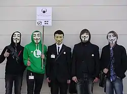El 10 de febrero de 2008, unas 7000 personas en más de 93 ciudades del mundo acudieron a las protestas.[78] Muchos manifestantes llevaban máscaras del personaje V de Vendetta (inspirado en Guy Fawkes, para simbolizar la lucha desigual del individuo contra el Estado) o tapado el rostro de alguna forma para proteger sus identidades frente a posibles represalias de la Iglesia.[79][80]