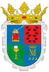 Escudo medio partido y cortado: el primero: 1º en campo de gules un creciente ranversado de plata y una estrella de ocho puntas de oro, puestos en palo, y 2º en campo de plata cinco panelas de gules bien ordenadas. Segundo: en campo de oro, un árbol de sinople terrasado de lo mismo. Escudo timbrado con una corona real de oro.[13] |