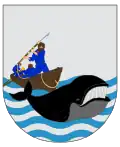 En campo de plata, un barco ballenero alterado sobre ondas de mar de azur y plata, en el que se ve a un marino que arponea una ballena de sable, también alterada, brochante sobre las ondas de agua.[1] |