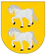 En campo de oro, dos corceles blancos andantes puestos en palo.[1] |