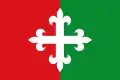 Bandera rectangular, de proporción 2:3, compuesta de dos franjas verticales iguales, roja al asta y verde al vuelo. Cargada en su centro con una cruz griega flordelisada blanca.[8] |