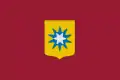 De proporción 2:3, sobre paño amarillo una cruz blanca cuyo ancho es 1/10 de la altura, perfilada en rojo en el cuartel superior izquierdo, de azul en el superior derecho e inferior izquierdo y de verde en el inferior derecho, los perfiles miden 1/20 de la altura; se puede incorporar el escudo.[13] |