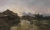 ![]() | Cristóbal Férriz Después del aguacero en Madrid 1877 63 x 106 cm óleo sobre lienzo Museo del Prado | Cristóbal Férriz y Sicilia (1850-1912). Abogado, coleccionista, entendido en arte y paisajista madrileño que llegaría a conseguir en la Exposición Nacional de 1878 medalla de tercera clase con Después del aguacero en Madrid, cuadro que a su muerte legó al Museo del Prado, en cuyos fondos se encuentra también el óleo Estanque en la Casa de Campo, adquirido por el Estado en la Nacional de 1881. | |||||||||||