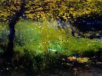![]() | Darío de Regoyos Zona de baños en Rentería 1900 76 x 57 cm óleo sobre lienzo Museo de Bellas Artes de Bilbao | Darío de Regoyos (1857-1913): paisajista asturiano, uno de los más personales post-impresionistas españoles. En sus años de formación, probablemente bajo el estímulo de su maestro, fue miembro en Bruselas de los grupos "L'Essor" (1881-1883) y "Les XX" (1883-1893).[18] | |||||||||||
