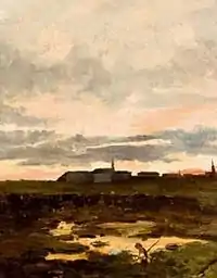 ![]() | Manuel Ramos Artal Paisaje crepuscular hacia 1890 óleo sobre lienzo | Manuel Ramos Artal (1855-¿1920?), pintor paisajista español que bajo el estímulo de Haes viajó por los Países Bajos, Italia, Francia y Portugal. Su máximo galardón oficial fue una tercera medalla en la Exposición Nacional de 1884 por su Paisaje de las cercanías del Cristo de la Vega (Toledo).[16]. Nombrado profesor de ascenso de la Escuela de Artes e Industrias de Madrid en 1915.[17]. | |||||||||||