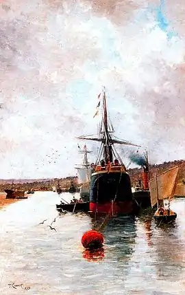![]() | Tomás Campuzano y Aguirre El carguero Avilés 1885 46 x 29 cm óleo sobre lienzo Museo de Bellas Artes de Córdoba | Tomás Campuzano y Aguirre (1857-1934): paisajista santanderino; como alumno de Haes fue uno de sus mejores herederos del arte del grabado.[7] Además de pintor y fino acuarelista, Campuzano fue director y profesor de grabado de la Escuela Nacional de Artes Gráficas, administrador de la Calcografía Nacional y corresponsal de "La Ilustración Española y Americana". | |||||||||||