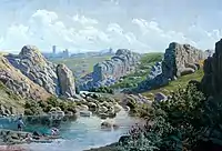![]() | Antonio Gomar y Gomar Abadía del Sacromonte (Granada) óleo sobre lienzo Biblioteca Provincial de Granada | Antonio Gomar y Gomar (1849-1911), discípulo de Rafael Montesinos en la Escuela de Bellas Artes de San Carlos, en Valencia. Instalado en Madrid, completó su formación de paisajista incansable con Haes. Fue amigo del también valenciano Joaquín Sorolla y alcanzó cierta fama por sus decoraciones al fresco en edificios madrileños como el Casino de Madrid, el Café de Fornos y el comedor del palacio de los duques de Santoña.[10] | |||||||||||
