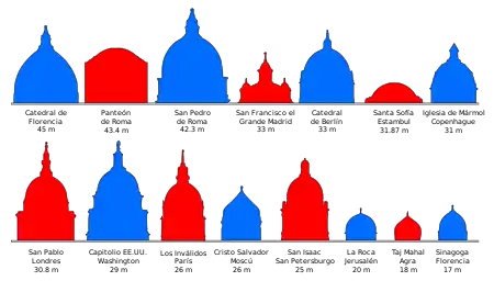 ![]() | 17,7[28][29] | Taj Mahal ( | Agra | 1631-1653 | Imperio otomano. Cúpula doble; cúpula interior tiene un diámetro de 17,7 m. | — | As | |||