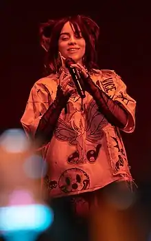 La cantante y compositora estadounidense Billie Eilish ha grabado dos álbumes de estudio, tres extended play, un disco en vivo y diversos largometrajes como invitada. En noviembre de 2015, a la edad de 13 años, publicó «Ocean Eyes» a SoundCloud que alcanzó un éxito instantáneo.[1][2] Un año después, firmó con Darkroom e Interscope Records.[3] En agosto de 2017, lanzó su primer EP de estudio Don't Smile at Me.[4] Fue escrito por Eilish y su hermano Finneas O'Connell, con la producción de este último.[5] Colaboró con otros artistas, incluidos Justin Bieber, Vince Staples y Khalid, también ha contribuido en canciones para bandas sonoras: «Ocean Eyes» para Everything, Everything , «Bored» para la primera temporada de la serie de Netflix Por trece razones y «Lovely» para su segunda temporada.