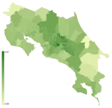 Los cantones josefinos de Santa Ana, Escazú y el cantón herediano de Belén ostentan los valores de IDH más altos entre todos los cantones listados, pero en general, los cantones de la provincia de Heredia son los que poseen los valores más altos en conjunto, ya que 8 de los 10 cantones que conforman la provincia tienen un índice de desarrollo humano muy alto. Por otra parte, el cantón de Matina en la provincia de Limón, posee el IDH más bajo de todo el país.
