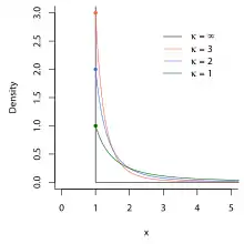 - La distribución degenerada en x0, en la que X toma el valor x0 con probabilidad 1. Puede ser considerada tanto una distribución discreta como continua.