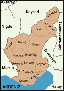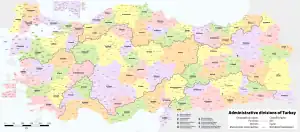 El territorio de Turquía se divide en provincias (o vilayets) para efectos administrativos. Las provincias se organizan en siete regiones con fines estadísticos, las mismas que no tienen fines administrativos. Cada provincia posee un distrito central (merkez ilçe) que sirve también como municipalidad provincial. La capital provincial generalmente lleva el nombre de la provincia, con las siguientes excepciones: Hatay (capital: Antioquía), Kocaeli (capital: İzmit), y Sakarya (capital: Adapazarı).[5][6]