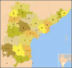 Desde la independencia de Telangana en 2014, el estado de Andhra Pradesh en la India consta de dos regiones divididas en 13 distritos:[1]