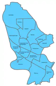Los 17 distritos municipales (Stadtbezirke) se dividen en 24 barrios (Stadtteile) y 78 distritos estadísticos (Statistische Bezirke).[2][3]