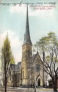 - Logie, Thomas R. Dilley ; foreword by John H. (2007). Grand Rapids in stereographs,1860-1900. Charleston, SC: Arcadia Pub. p. 63. ISBN 9780738551227. «The spire on the church was an amazing 217 feet in height, The entire building was destroyed in a catastrophic fire in 1917...»