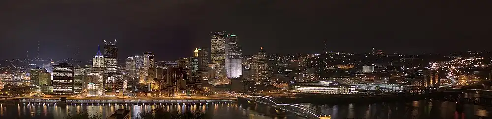 La historia de los rascacielos de Pittsburgh comenzó con la finalización en 1895 del Carnegie Building; esta estructura, elevándose 13 plantas, fue el primer rascacielos de estructura de acero construido en la ciudad.[3][4] Sin embargo, no fue la estructura más alta de la ciudad ya que no sobrepasó la torre de 249 pies (76 m) del Juzgado del Condado de Allegheny, que fue completado en 1888.[5] El Carnegie Building fue demolido posteriormente en 1959 para hacer espacio a una expansión de los grandes almacenes Kaufmann's (ahora Macy's).[6] Pittsburgh experimentó un gran boom de construcción desde finales de los años 60 hasta finales de los 80. Durante este período, se construyeron 12 de los 21 edificios más altos de la ciudad, incluyendo los tres más altos: U.S. Steel Tower, BNY Mellon Center, y PPG Place. La ciudad alberga 10 rascacielos de altura superior a 492 pies (150 m), de los cuales dos se clasifican entre los más altos de Estados Unidos. Globalmente, el skyline de Pittsburgh se clasifica (según edificios construidos y en construcción de más de 492 pies (150 m) de altura) segundo en Pensilvania (tras Filadelfia), cuarto en el Noreste (tras Nueva York, Boston y Filadelfia) y 13º en los Estados Unidos.[nota 1] En abril de 2008, había 149 edificios altos completados en la ciudad.[7]