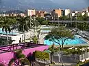 Complejo Acuático que se construyó para los juegos en la Unidad Deportiva Atanasio Girardot, se puede observar al fondo la línea del Metro de Medellín.