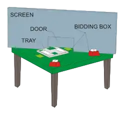 En torneos de cierta importancia hacia arriba se introduce el uso de "cortinas" o "pantallas". Son paneles divisorios instalados por sobre la mesa de juego, impidiendo que los compañeros puedan verse mutuamente, para evitar así que se puedan proporcionar información no autorizada. Norte puede ver a Este y Sur a Oeste. Las conversaciones relevantes deben hacerse con lápiz y papel de modo que no se escuchen al otro lado del panel. Las tarjetas con las voces o remates se colocan sobre una bandeja o carro, cuyo nombre deriva del hecho que a través de una ventanilla en el centro del panel, se traslada en un va-y-viene con los remates que se van efectuando, y que cada jugador pone en su arista de la bandeja. La puertecilla central permanece bajada durante este proceso, pero aun así hay una pequeña separación del panel con respecto a la superficie de la mesa que permite que la bandeja pueda deslizarse de un lado al otro. Terminado el remate los jugadores recuperan sus tarjetas y el jugador que le corresponde efectúa su salida inicial. Si lo hiciese equivocadamente el compañero, la carta se puede devolver y no hay penalidad, ya que la cortina está aún abajo. Una vez que la salida se confirma, se levanta la portezuela y el muerto se tiende para que pueda ser visto por los jugadores que están al otro lado del panel, no así sus caras. Al término del carteo se vuelve a cerrar para iniciar el juego de la mano siguiente.