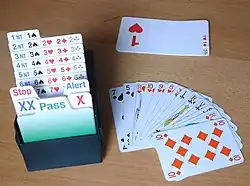 Las cajas de subasta permiten hacer las declaraciones usando tarjetas en vez de anunciarlas oralmente. Esto previene que los jugadores de mesas cercanas escuchen la subasta y evita que las inflexiones o maneras de hablar transmitan información no autorizada al compañero.