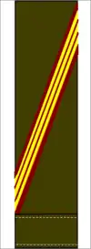 El personal de oficiales usan como insignias de su jerarquía barras verticales estriadas de color dorado y sobre hombreras o palas con el "vivo" de color del arma o servicio.