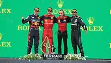 Celebración del podio, Leclerc (centro), Verstappen (izquierda) y Hamilton (derecha). Laurent Mekies, director de carrera de Ferrari, los acompaña en el podio.