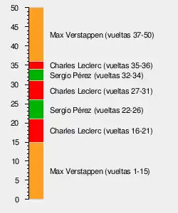 El otro llamado de auto de seguridad fue cuando George Russell chocó contra Max Verstappen, recibiendo 5 segundos de sanción.[13]