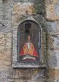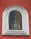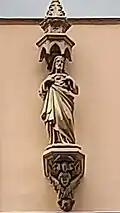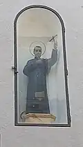 42.8158232, -1.6455265 | Se trata de altorrelieve policromado de finales XVI o comienzos del XVII[13] La mano del santo aparece rehecha y no bien ajustada al resto de la imagen, esta particularidad parece ser resultado de los sucesos acaecidos en el siglo XVII, cuando uno soldados borrachos, a pesar de estar en servicio de vigilancia, derribaron la imagen que resultó dañada. Conocidos estos hechos por el Virrey, los militares fueron procesados y condenados a desagraviar públicamente al santo.[14] |