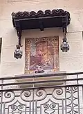 42.81816678103254, -1.6458740260805311 | El modo en que se dispone el azulejo sobre una pequeña ménsula, com un tejaroz del que cuelgan dos faroles, da a la imagen la apariencia de una hornacina y pone de manifiesto la pervivencia de una tradición decorativa y devocional. Para lo que en este caso, se aprovechó la nueva construcción de ese solar |