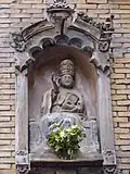 42.8181176248564, -1.6442413430583245 | Talla de la primera mitad del siglo XVI, de ecos flamenquizantes; estuvo situada en una hornacina en el Portal de la Galea que daba entrada al Burgo de San Cernin, en la zona conocida como Portalapea, por situarse a los pies de este Portal. Desaparecido ese tramo de las murallas en el siglo XVII[1] , la imagen se conservó conservar en la fachada de uno de los edificios construidas sobre los fundamentos de las murallas en la casa nº 14 de la calle San Saturnino[2] hasta que, tras la recuperación de la parte baja de las murallas de esta zona, la imagen quedó en la belena, adosada a los muros que se apoyan en los fundamentos de las murallas |
