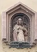 42.8191271, -1.6418872 | A partir de la publicación de la encíclica Annum Sacrum, con la que el papa León XIII consagraba el mundo al Sagrado Corazón, e incluso en los años anteriores, en muchas casas particulares, tanto en la puerta de entrada al piso como en las fachadas se colocaron placas con una imagen del Sagrado Corazón,[22] algunas de ellas se encuentran todavía en las calles de Casco Antiguo de Pamplona, pero en ningún caso tienen la entidad y características de este altorrelieve que, por su forma, se asemeja a las tradicionales hornacinas del barrio. |