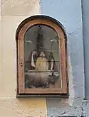 42.81922973485906, -1.6456846078183167 | La hornacina fue realizada en 1981 por encargo del Ayuntamiento, respondiendo así a la petición que hizo la subcomisión del encierro en la Comisión Especial de Fiestas de San Fermín, para que se dispusiera de una hornacina en la que se pudiese conservar la imagen del santo que desde 1979 se coloca en esa zona, y que continua una tradición, iniciada en 1965 o 1966, por la que antes de iniciar el encierro los mozos que van a correrlo se dirigen al santo pidiendo su protección.[6] |