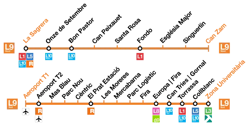 La línea 9 o L9 —La Sagrera ⇔ Can Zam— es una línea de ferrocarril metropolitano automática operada por Transportes Metropolitanos de Barcelona. Fue inaugurada el 13 de diciembre de 2009 con cinco estaciones y se convirtió en la primera línea de metro totalemnte automatizada en España.[9][10] Actualmente dispone de nueve estaciones y 7,9 kilómetros de longitud.