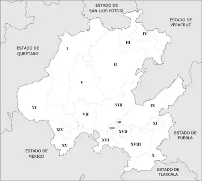 ![]() Mapa del estado de Hidalgo dividido en los dieciocho distritos electorales locales. | ||||||||||||||||||||||||||||||||||||||||||||||||||