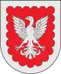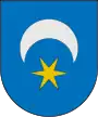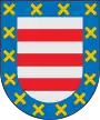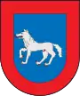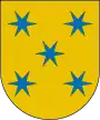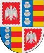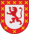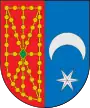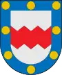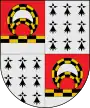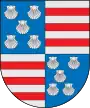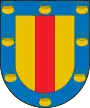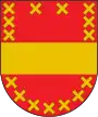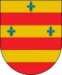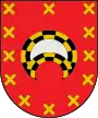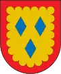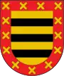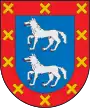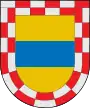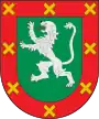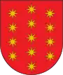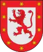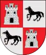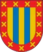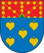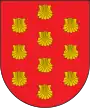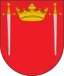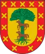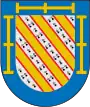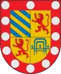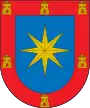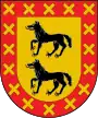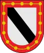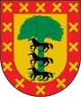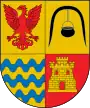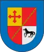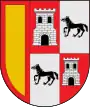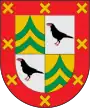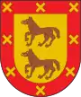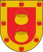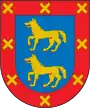 De oro, dos lobos de sable; bordura de gules con diecisiete aspas de oro. |