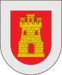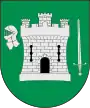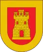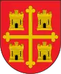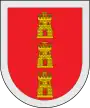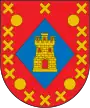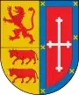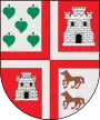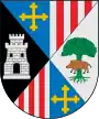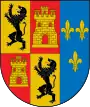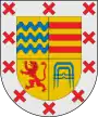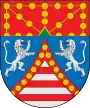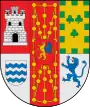 Terciado en pal: 1 de gules, castillo de plata, cortado (color desconocido), un escudete de plata cargado de tres fajas vibradas de azul; 2 de Navarra, cargado de un escudete de gules con grifo de oro armado y alado de azul; 3 de oro, con tres hojas o tréboles y bordura componada (color desconocido); cortado de plata, león de azul. |