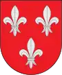 De plata, tres fajas de gules, mantelado de azul, dos leones afrontados de plata, brochante sobre la partición un cabrio combado de gules cargado de una cadena de oro; el todo bajo un jefe de gules con medio carbunclo cerrado pomelado naciente, de oro. |