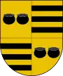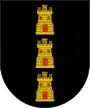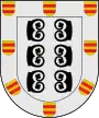 De oro, tres palos de sable; bordura de gules con catorce aspas de oro. |