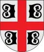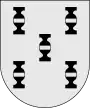 De plata, cruz llana de gules, cantonada de cuatro eslabones de sable adosados. |