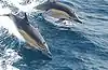 | Delphinus delphis | Delfín común | Delfines de tamaño mediano. Los adultos miden entre 1,9 y 2,5 m y pueden pesar entre 80 y 235 kg. Los machos son generalmente más grandes. La parte posterior es oscura y el vientre es blanco, mientras que a cada lado hay un patrón de reloj de arena de color gris claro, amarillo u dorado en el frente y gris sucio en la parte posterior. Tienen rostros largos y delgados con hasta 50 a 60 dientes pequeños, afilados y entrelazados a cada lado de cada mandíbula. | ![]() | ||
