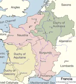 | Con la muerte de Pipino en 768, el Reino Franco se divide entre sus hijos Carlos y Carlomán, quedando el norte de Austrasia en manos del primero, y el sur de esta en manos de Carlomán. | |||||