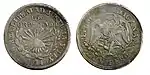 2 ¢4,2819,00AgGorro frigio radiante.Nomograma, guirnalda y año de acuñación.[2]Estriado.1915.Aguascalientes.Aguascalientes.