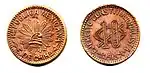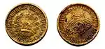 Monedas acuñadas por el Ejército Constitucionalista. Hay variedades en la leyenda y los rayos del gorro frigio del anverso y en la leyenda y el monograma del reverso.