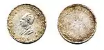 $ 1Variable.[37]38,50 (aprox.)[38]Ag+CuEscudo de armas mexicano y nombre oficial del país: REPUBLICA MEXICANA. Contramarca: "G.C."Gorro frigio sobre rayos solares.Irregular.Sin fecha.[41]Culiacán.[42]Sinaloa.