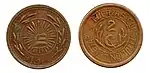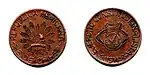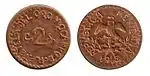 2 ¢4,2819,00CuGorro frigio radiante.Nomograma, guirnalda y año de acuñación.[2]Liso.1915.Aguascalientes.Aguascalientes.
